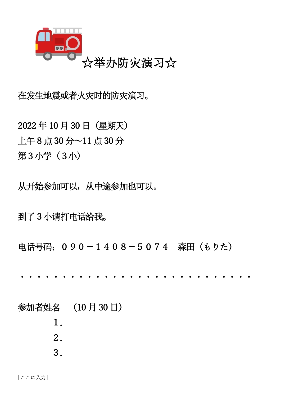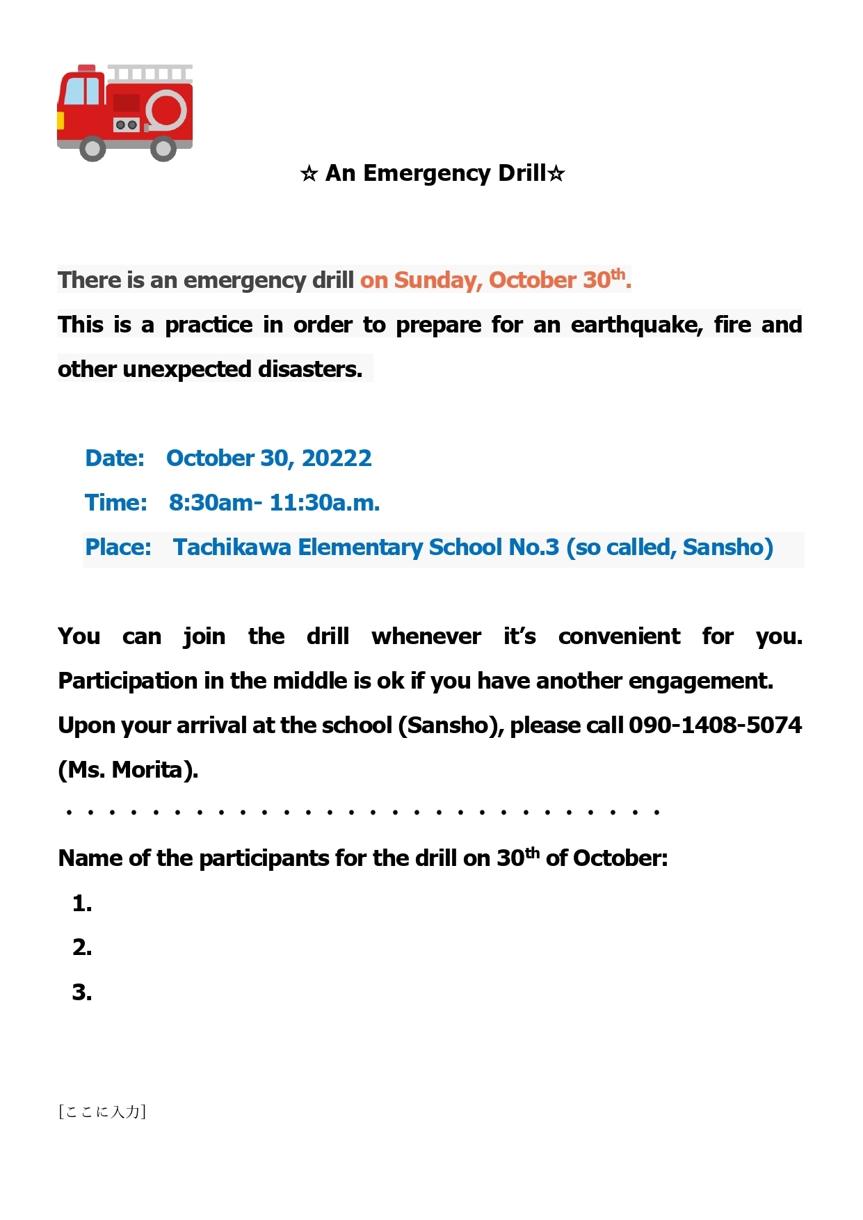 防災訓練 チラシ (やさ日版)2022.10.pdf 防災訓練チラシ 英語版 202210_Emergency Drill(English).pdf