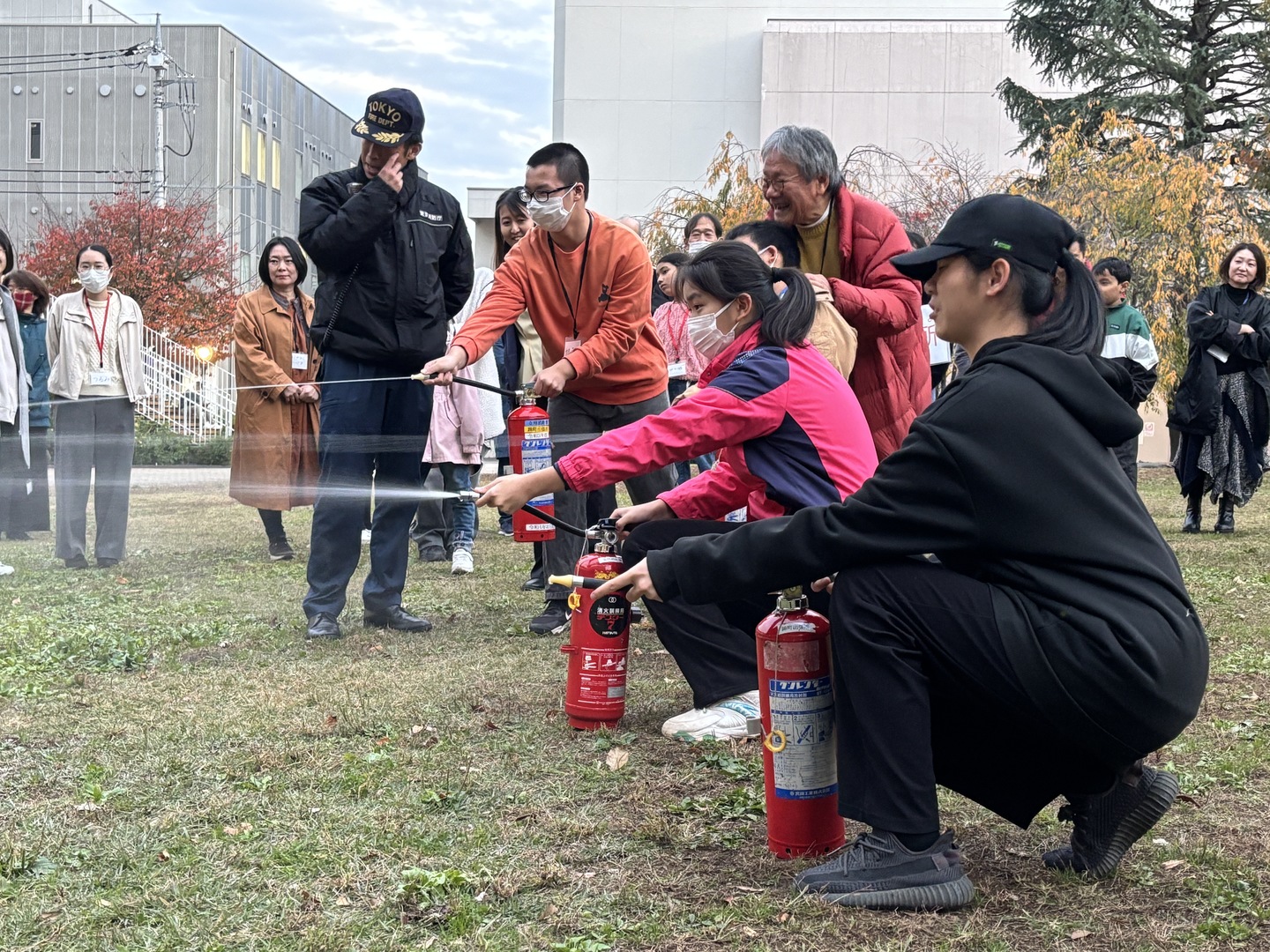 防災訓練の内容:AEDの利用法、公園への避難、消火器の放水訓練など